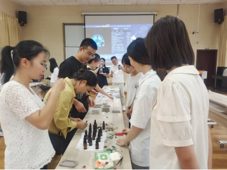 活动开始,老师们认真挑选花瓶样式,搭配不同的干花花束再滴上精油,制作出了自己喜爱的肉桂香薰;随后开始自制香薰蜡牌,从选模具、浇灌蜡油、选干花饰品、到凝固、最终脱模成型,老师们的喜悦之情溢于言表。制作完成后,老师们表示这次活动很有意义,在制作的过程中满满都是参与感和成就感,还感受到浓厚的节日氛围。