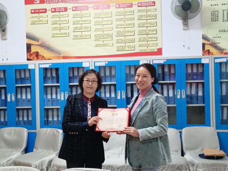 照片一:李晓芳副主任为贵阳市观山湖区第一幼儿园颁发了优秀实习基地奖杯与奖状