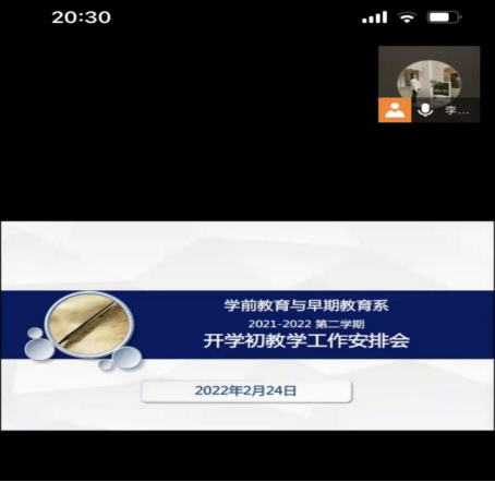 2022年2月24日晚上20点30分,学前教育与早期教育系在线上召开2021-2022学年第二学期开学教学工作会议,本次会议由李林媛老师主持,杨丽副主任、李晓芳副主任及学前教育与早期教育系所有任课教师参加此次会议。
