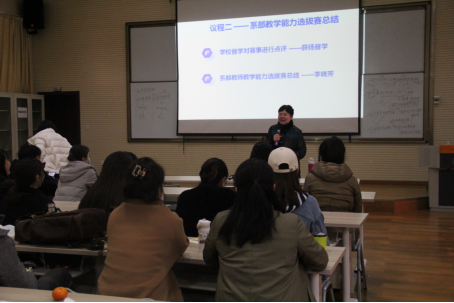 议程一,学前教育与早期教育系教师教学能力大赛参赛教师说课。9位参赛教师分别从学情分析、课程信息、教学目标、教学重难点、教学策略、教学过程、教学反思七个方面进行说课,教师说课是本次学前教育与早期教育系教师教学能力大赛的第二个部分。说课结束后,教学督学薛扬老师对参赛教师进行点评、给予肯定,并对下一步教学工作做出要求。随后李晓芳副主任对本次教师教学能力选拔赛进行总结,老师们准备充分、设计规范、实施有法、大胆创新,同时对需要改进的地方也进行了一一说明,有助于教师教学的反思改进,促进老师相互学习,为共同提升课堂教学质量迈向更好的台阶。最终本次教学技能选拔赛推选出了2个课程团队代表学前教育与早期教育系参加校级教学比赛。