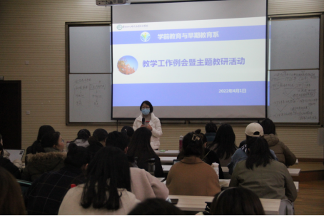 2022年4月1日下午1点,学前教育与早期教育系在合班教室三围绕“岗课赛证融通,提升教学能力”主题召开专题教研。本次会议共有4个议题,教师教学技能大赛参赛教师说课、赛事总结、校系两级教学管理制度学习、师范专业认证——教育教学工作推进、学前教育专业学生教学技能大赛题库研讨。本次会议由李晓芳副主任主持,校督学薛扬老师,学前教育与早期教育系全体专任教师共计41人参加本次会议。
